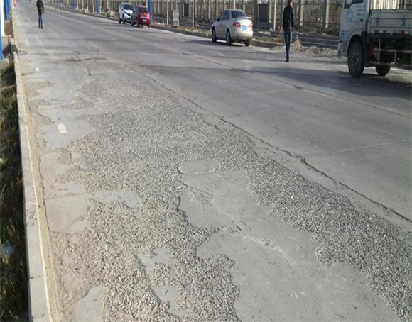 3、施工时,材料水灰比过大,导致路面强度太差,硬度不够,这也很容易引起路面起砂的现象。所以,在进行道路施工或者道路表层病害修补时,都应该注意控制材料的水灰比,确保道路的施工质量。