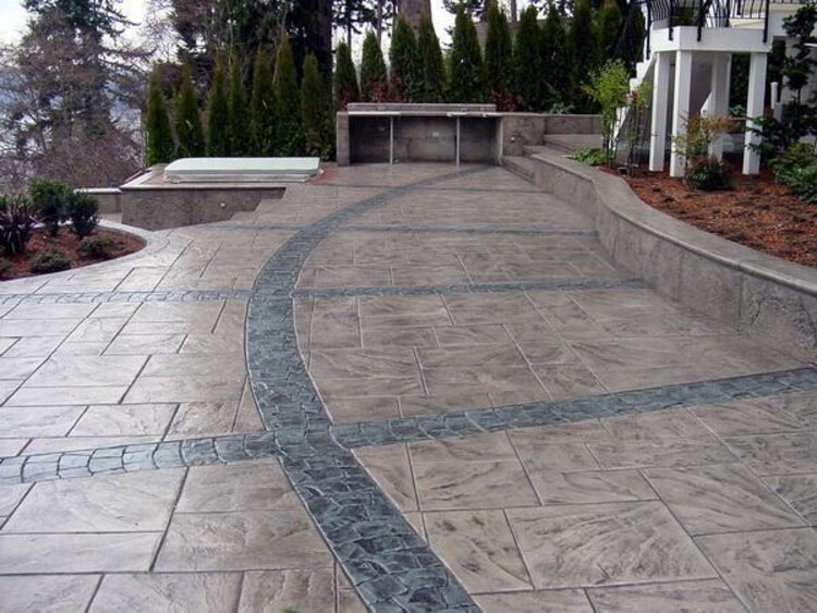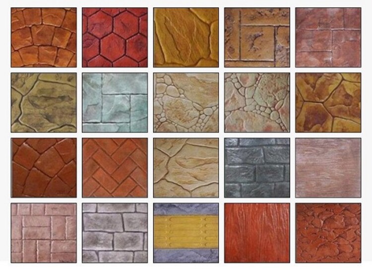 花纹效果的彩色路面产品,所使用的压模地坪材料主要有彩色强化料、彩色脱膜粉和透明保护剂。