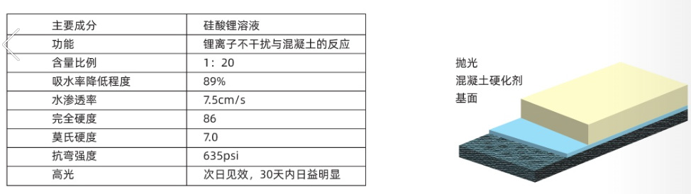 锂基型混凝士固化剂的主要成分是含锂化合物,例如锂硅酸盐。当锂基型混凝土固化剂涂在混凝土表面时,其中的锂化合物会与混凝土中的游离钙离子反应生成锂钙硅酸盐。锂钙硅酸盐具有较高的结晶度和硬度,能够填充混凝士中的微孔和毛细孔,增强混凝土的强度和耐久性。同时,锂钙硅酸盐还能够与混凝土中的氢氧化钙反应,生成水和稳定的硅酸盐,从而减少混凝士的碱-骨料反应和碳化。