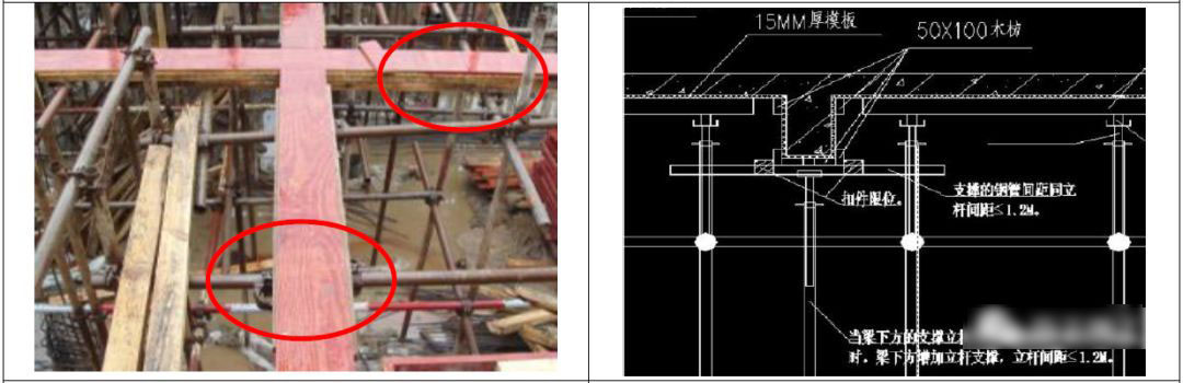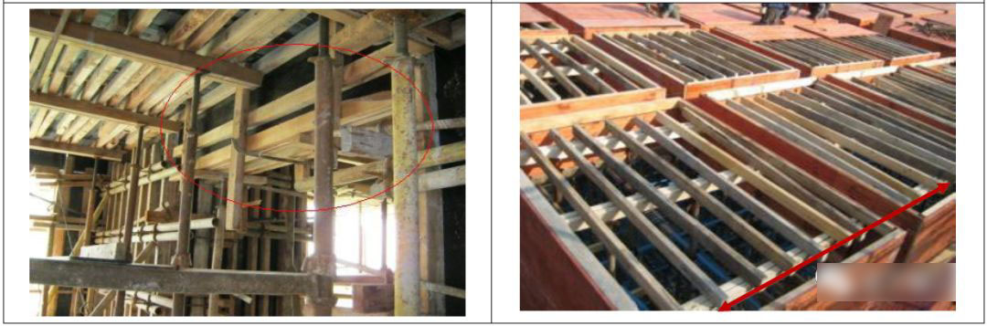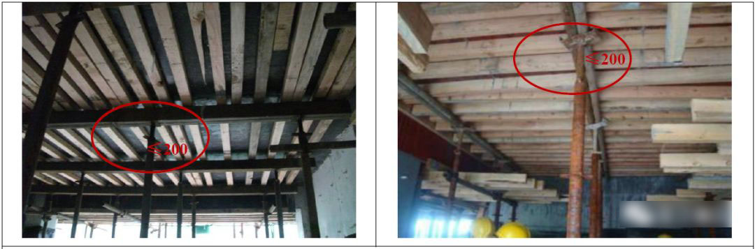 6.3 楼板模板支撑木枋间距≰200mm ;木枋端部离梁侧模板≰150mm;支撑木枋不得在同跨立杆搭接。