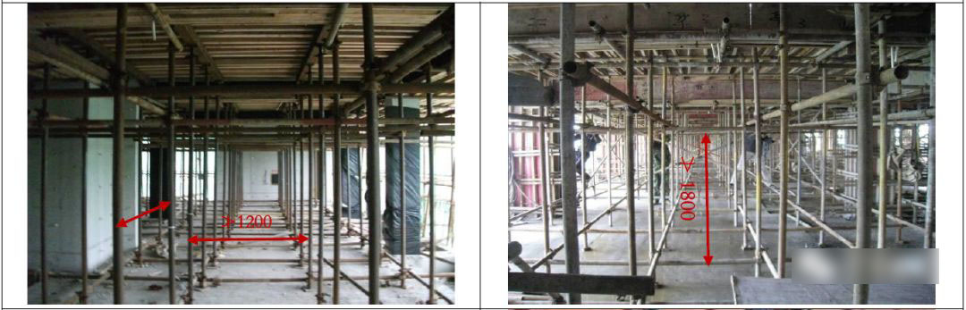 6.1 楼板第一排立杆距墙≰500mm,楼板支撑立杆纵、横向间距≰1.2m,扫地杆距楼面≰200mm,中间水平拉杆步距≰1800m。
