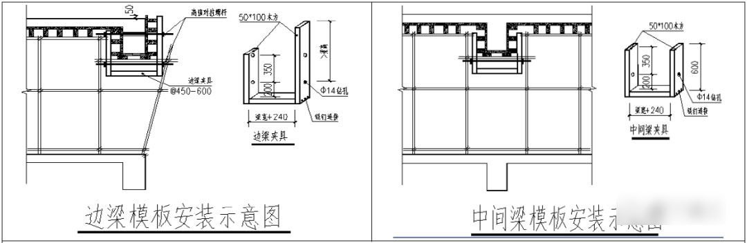 5.3 截面高度≱500mm的梁应在侧模中部设臵一道水平木枋,避免胀模;外边梁≱600mm时,应设臵对拉螺杆并在梁下口采用专用夹具进行加固,间距≯600mm;中间梁高≱500mm时采用专用夹具或 “步步紧”进行加固。